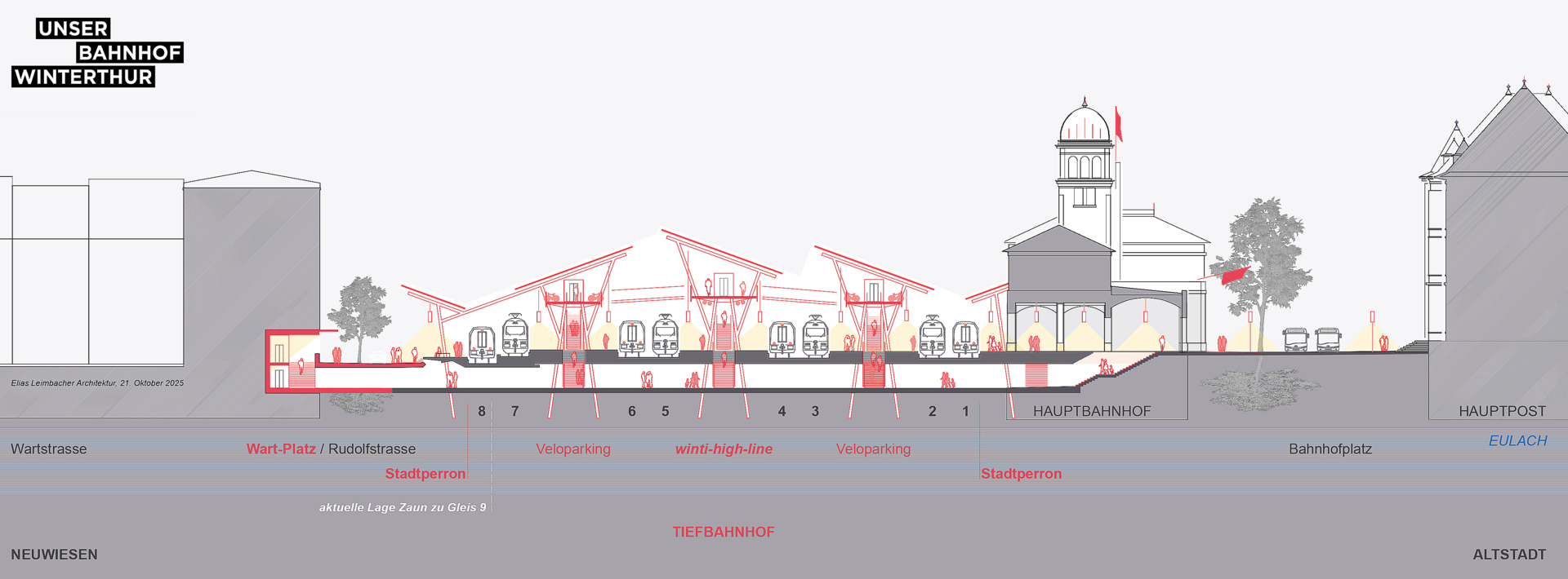 Wie wäre es mit einer «High-Line» über den Gleisen beim HB Winterthur – einer vernetzenden linearen Ebene, die vom Spital (Gleisdreieck) bis zum Lagerplatz reicht und Perrons, Stadtteile und die Region qualitativ Bypass-artig verbindet ???